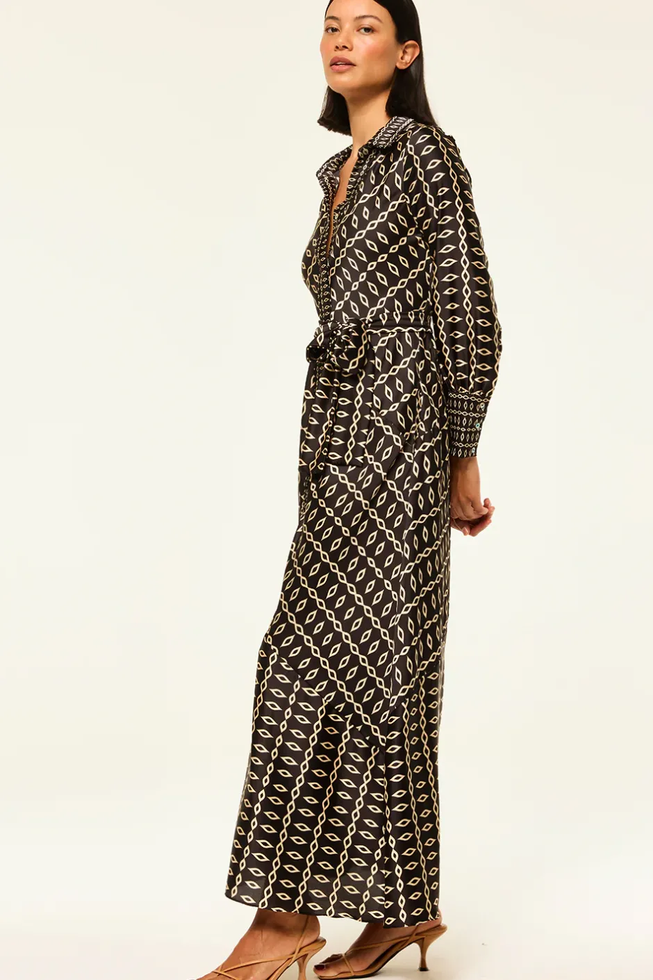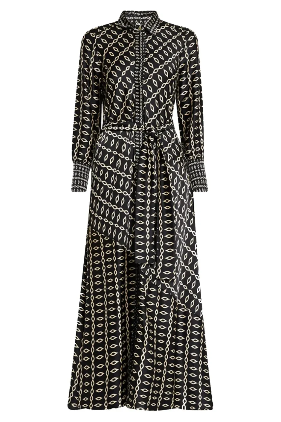 Stevie is an update on the classic shirt dress, rendered in a timeless Go West Geo printed satin on black ground. A fully covered button placket with spread collar and long sleeves with wide button cuffs. An optional self-tie belt. This versatile and universally flattering maxi length silhouette will carry you through fall into winter. Pair with everything from knee high boots to strappy heels.