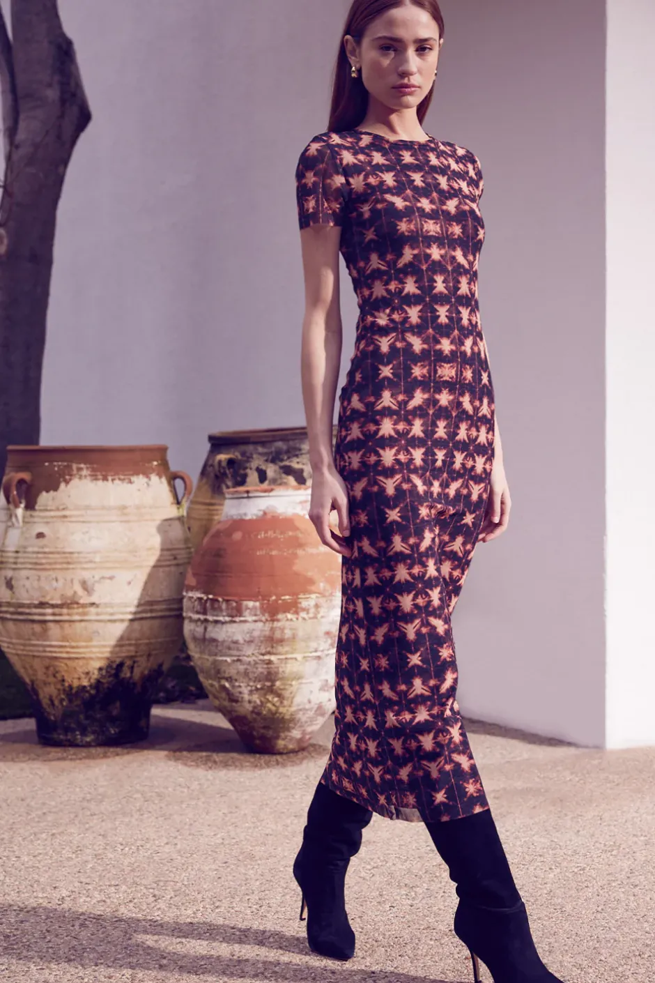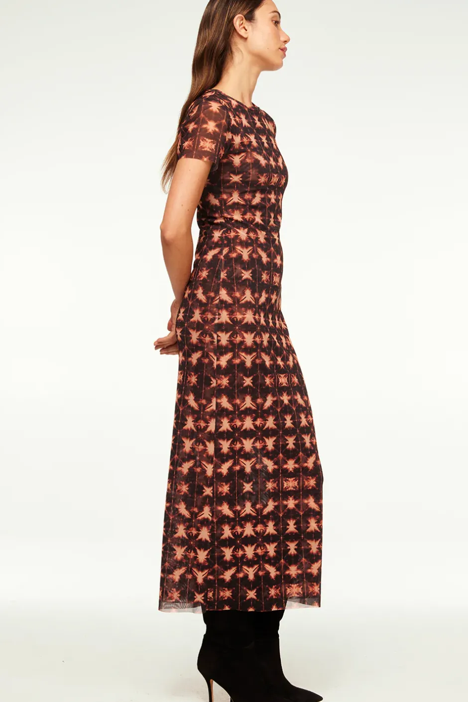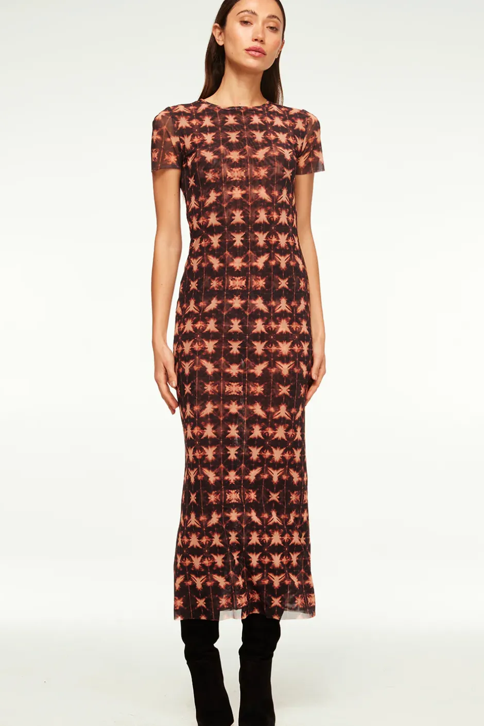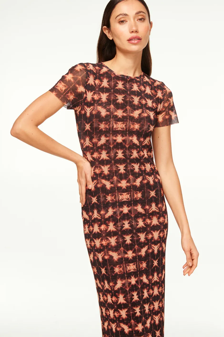 Our best-selling Vanessa dress is back in a fall-ready Angel Glow tie-dye mesh. This fitted pullover style features a crew neckline and short sleeves. Double lined. Pair with everything from flats to suede boots for the cooler weather.
