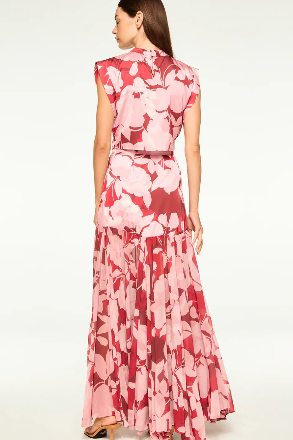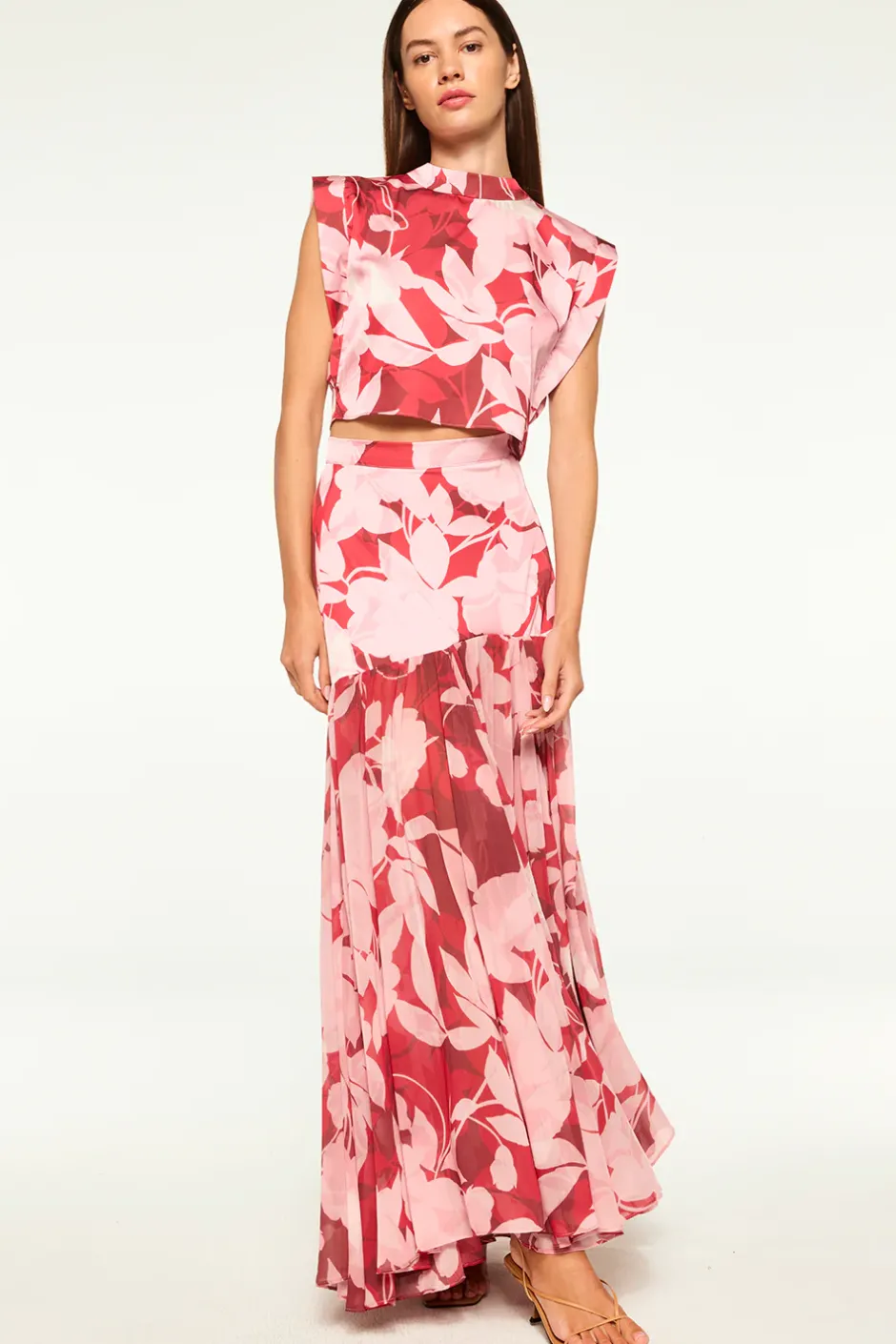Stun in our all new Yara maxi skirt. This chic drop waist style features a fitted satin waist to the mid thigh where a curved hem meets a flowing double lined chiffon skirt in our eye-catching Flora Rosada print. A banded waist and hidden side zip closure. Complete the look with the coordinating Inah top.