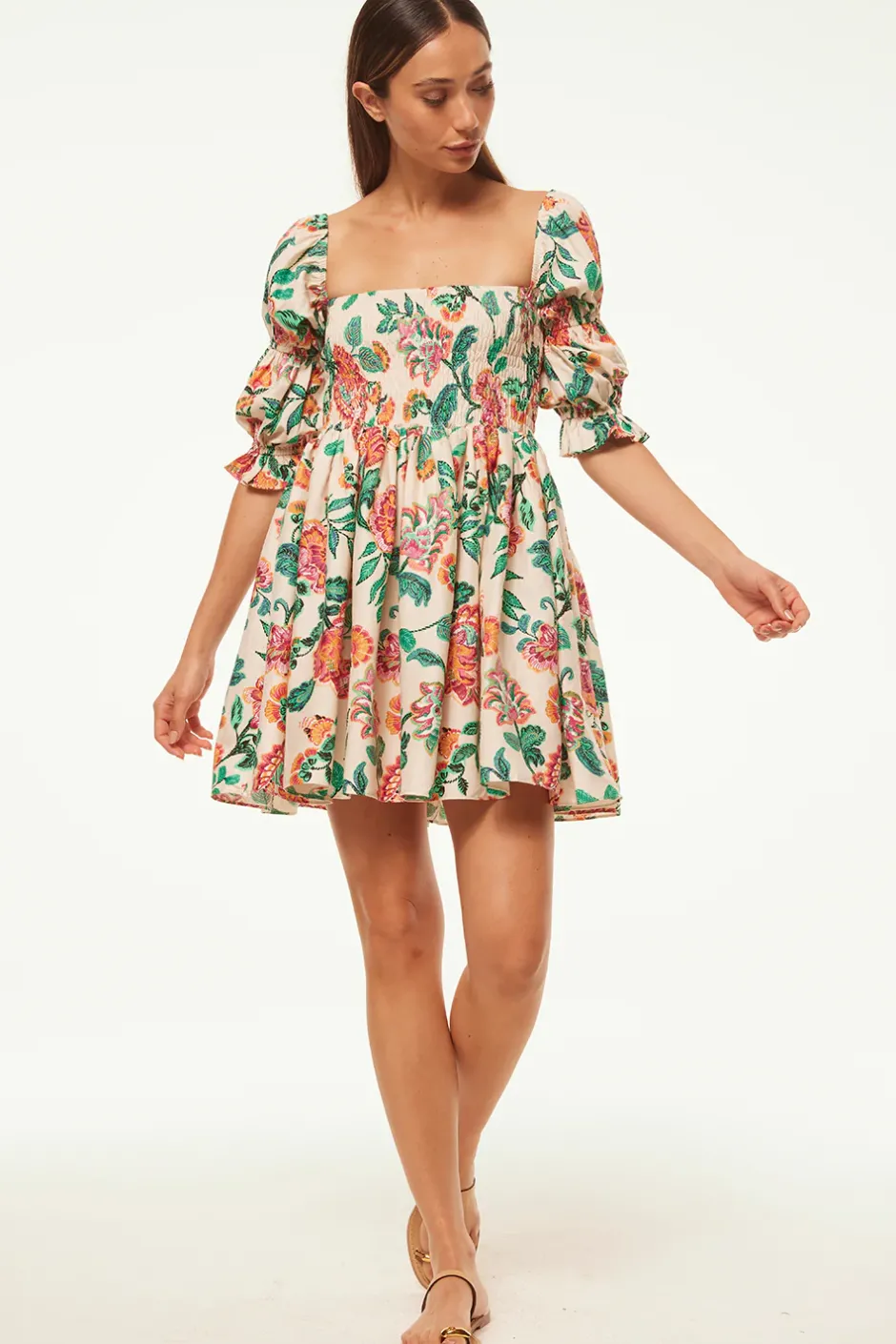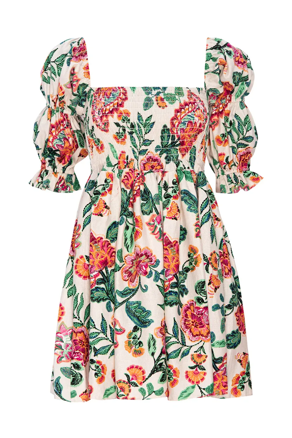 The Zadie dress is an effortless baby doll silhouette cut from a Malika Paisley Floral linen. A square neckline with smocked bust leads into an a-line skirt. Elbow length elastic puff sleeves feature a ruffle trim and can be worn on or off the shoulder. This classic MISA silhouette will be go to for years to come.