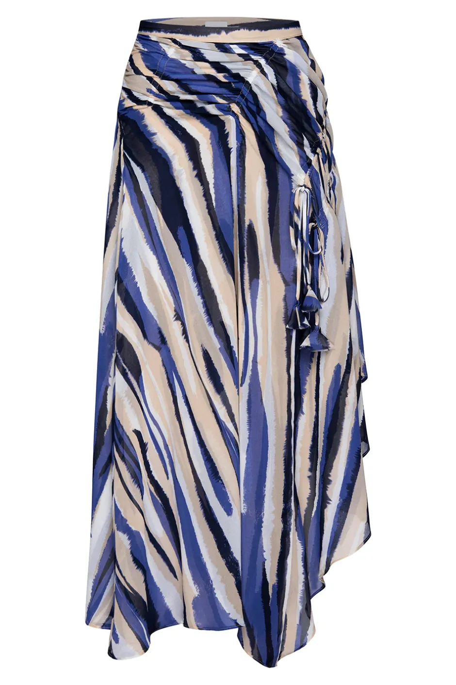 Zulika is a dazzling handkerchief style midi skirt with an adjustable cinched hip tie detail for the perfect asymmetrical look. Featuring a banded waist with hidden side zip. Pair with the coordinating Dalma top and a sleek sandal to complete the look.